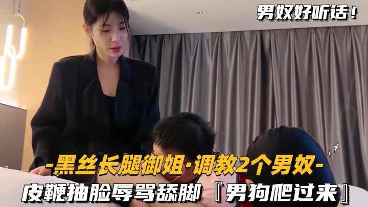 [黑丝长腿御姐调教2个男奴]皮鞭抽脸辱骂舔脚,男狗爬过来